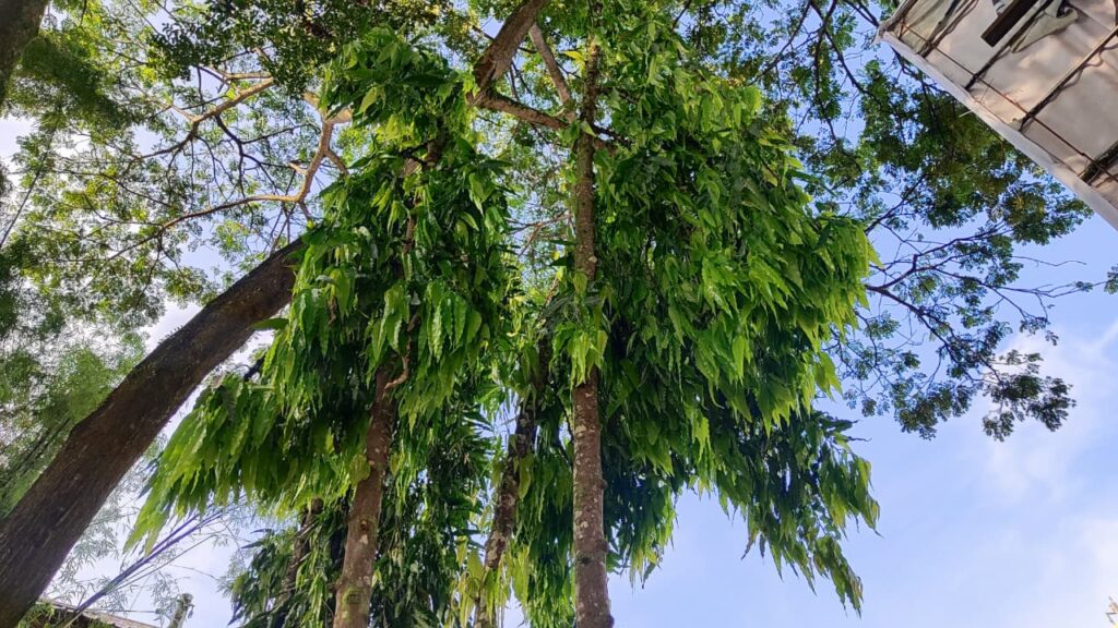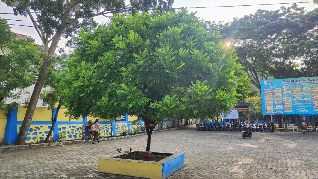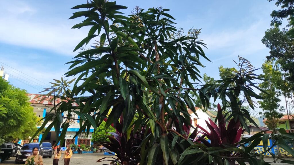 Yang pertama, kalian bakal liat pohon ini di taman belakang dekat kelas X-H. Setelah kalian lihat gambar diatas, coba tebak itu pohon apa ? benar itu pohon Matoa (Pometia pinnata), tanaman khas Papua yang jadi kebanggaan. Pohon ini punya buah manis yang mirip kelengkeng, tapi dengan cita rasa khas. Selain itu, batangnya kokoh dan daunnya rindang, bikin suasana sekitar jadi lebih sejuk. Matoa bukan cuma enak buahnya, tapi juga jadi simbol kekayaan alam Papua yang harus dijaga.