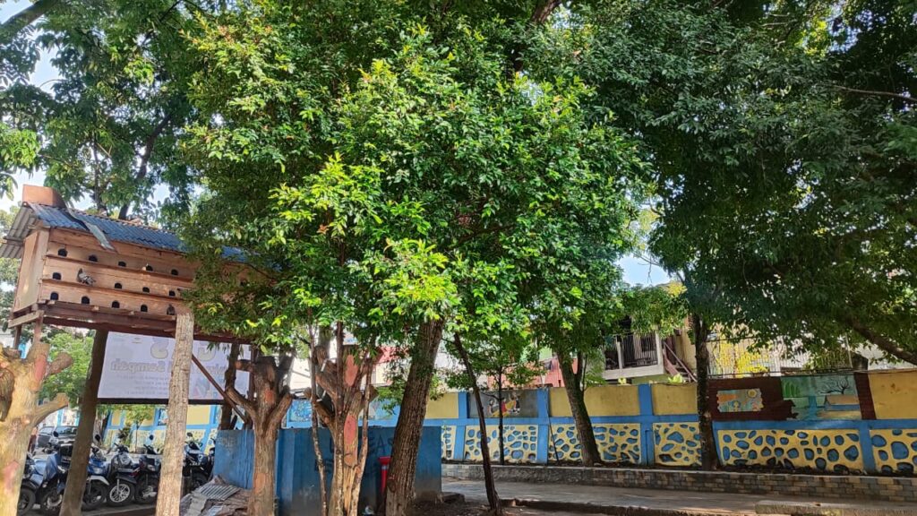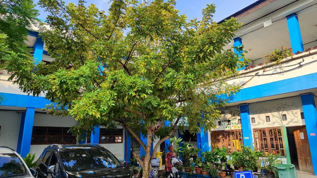 Selanjutnya, yuk kita bahas pohon yang ada di tengah lapang dekat ruang guru. Ini namanya pohon Kiara Payung (Filicium decipiens). Bentuknya adalah inspirasi dari namanya yaitu tajuknya melebar seperti payung. Daunnya kecil tapi rapat, bikin area di bawahnya adem banget. Cocok jadi tempat berteduh saat istirahat, sekaligus membantu mengurangi panas di lingkungan sekolah.