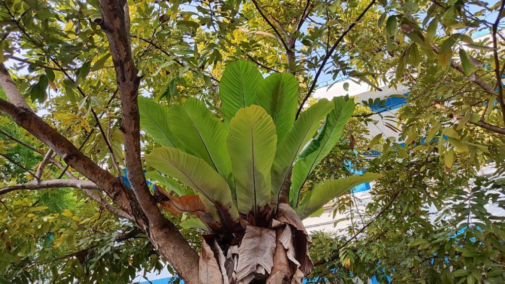 Kalau lihat tanaman yang “nempel” di batang pohon kusambi di depan XII-C, itu kemungkinan Paku Sarang Burung atau kadaka (Asplenium nidus). Bentuk daunnya lebar seperti sarang, dan uniknya dia tidak tumbuh di tanah, tapi menumpang di pohon lain. Selain cantik, tanaman ini juga membantu menjaga kelembapan udara.